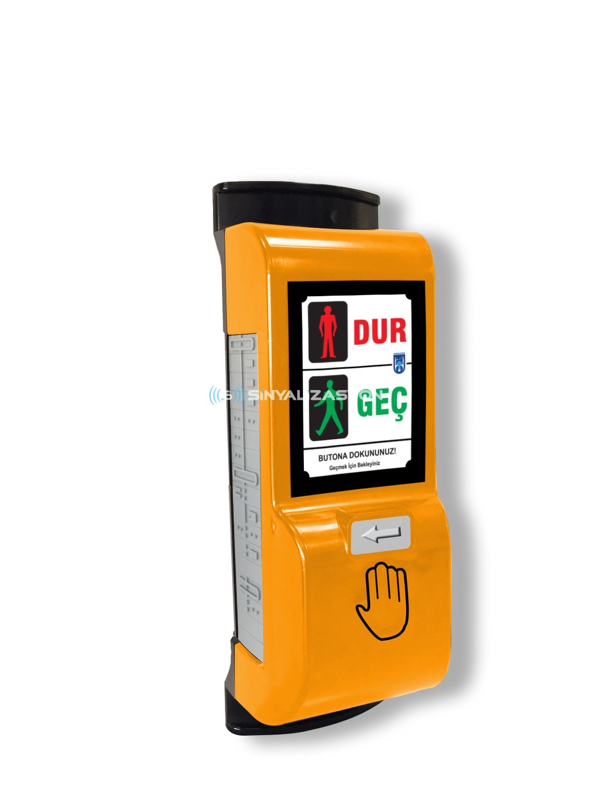 Назначение сигнальных кнопок для пешеходов - информировать устройство управления перекрестком, обнаруживая касание на участке шоссе, где водители движутся с высокой скоростью, где интенсивное движение транспортных средств, где нет надземных и подземных переходов, и облегчать проход пешеходов. Сигнальная кнопка для пешеходов выполнена в виде сенсорного экрана, акустически возбуждаемого в зависимости от окружающего звука для обеспечения безопасности движения пешеходов и водителей. Благодаря удобному и понятному интерфейсу программирования,сигнальные кнопки для пешеходов могут быть запрограммированы с помощью компьютера для выбора местоположения перекрестка, выбора человеческого голоса и голоса робота, окружающего звука или фиксированного звука и уровня возбуждения. Цифры «STOP» - «PASS» на модуле могут быть оформлены в соответствии с особенностями учреждения или региона и могут подсвечиваться красным и зеленым цветами. Учетывая потребность для слабовидящих пешеходов при разработке устройства, на левой стороне устройства размещен план перекрестка, выполненный шрифтом Брайля, а на правой - описание, выполненное шрифтом Брайля. Благодаря прочной конструкции корпуса устройство можно легко установить на резиновом аппарате на столбах диаметром 102 мм и 114 мм на всех регулируемых перекрестках.